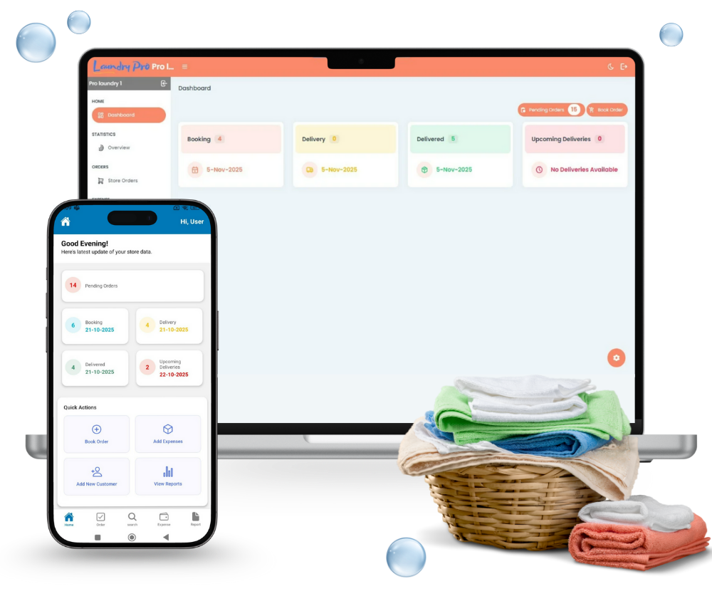 Easily manage all your laundry operations from one dashboard — from placing orders to tracking deliveries and managing daily activities with complete control.